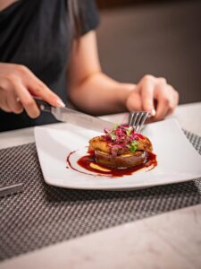 とろけるナスにフォアグラをのせた贅沢な一皿。